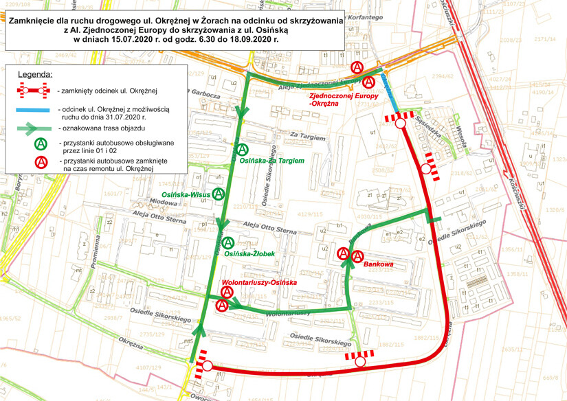 Od godziny 6:30 w środę, 15 lipca do 18 września zamknięty dla ruchu kołowego będzie odcinek ul. Okrężnej od skrzyżowania z ul. Osińską do skrzyżowania z al. Zjednoczonej Europy.