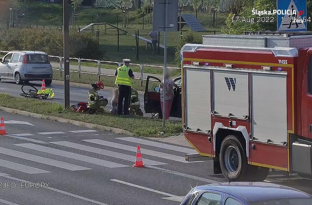 Wczoraj przed godziną 18:00 na przejściu dla pieszych przy Alei Zjednoczonej Europy doszło do bardzo groźnie wyglądającego zdarzenia drogowego z udziałem rowerzystki. Od ulicy Boryńskiej na przejście dla pieszych wjechała rowerzystka, widząc, iż pojazd poruszający się po prawym pasie jedzie z niewielką prędkością. Niestety kierująca samochodem marki Fiat Panda 72-letnia mieszkanka powiatu pszczyńskiego uderzyła w 29-letnią żorzankę, która wjechała rowerem wprost pod nadjeżdżający samochód.