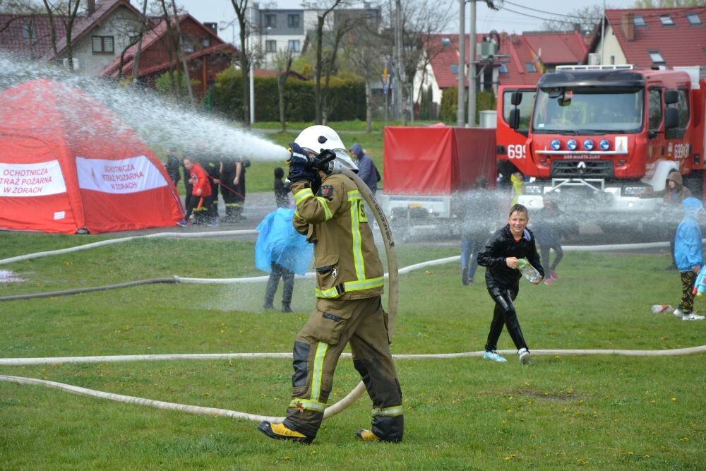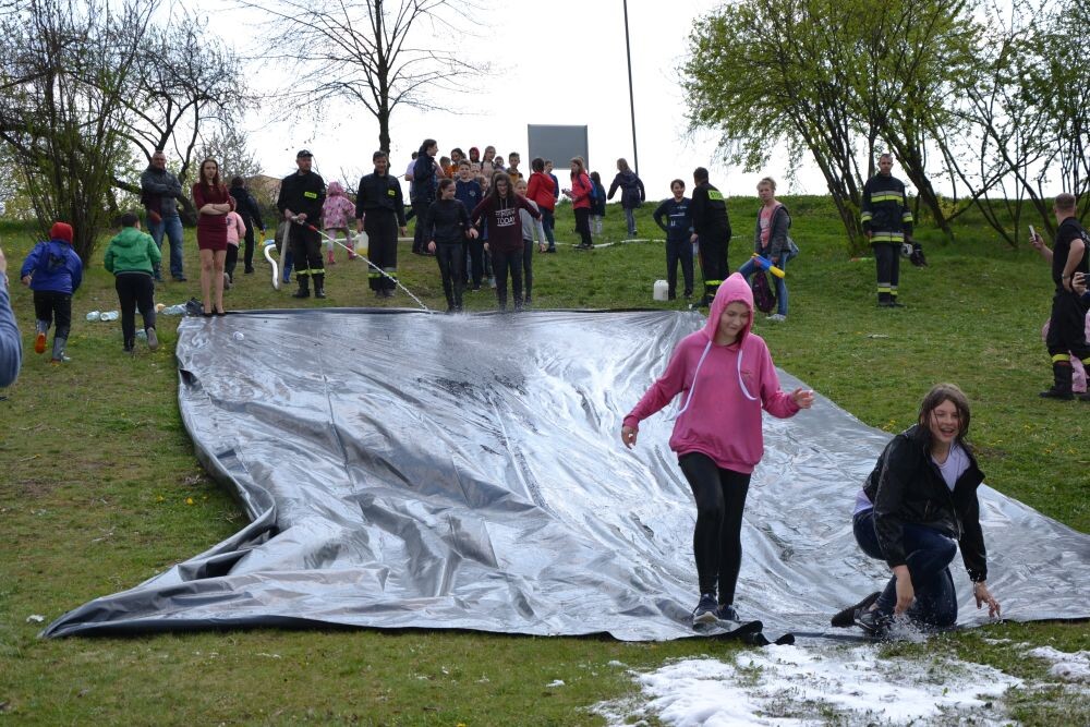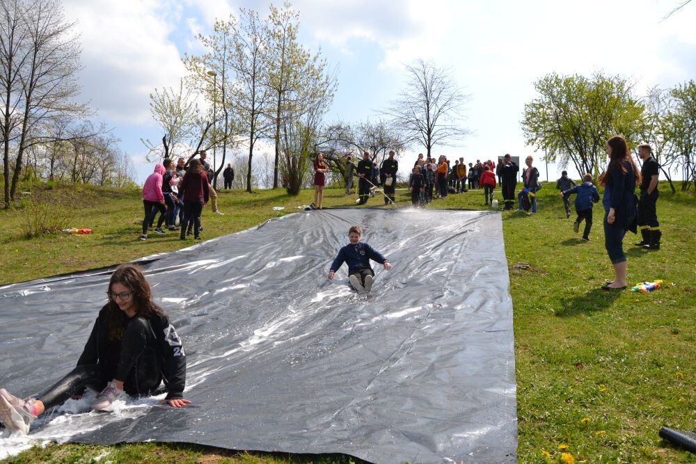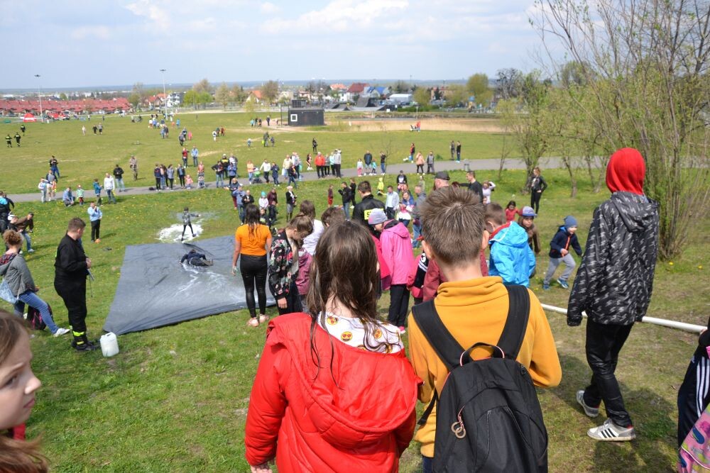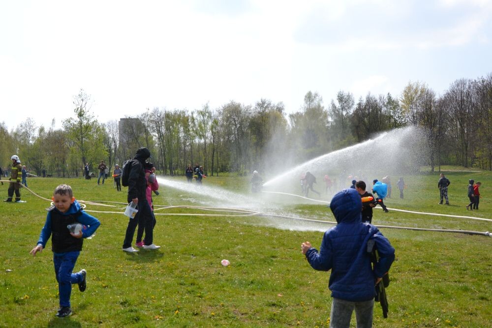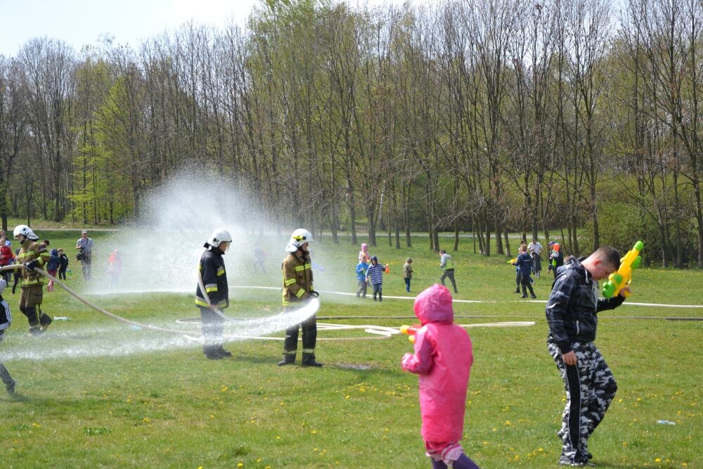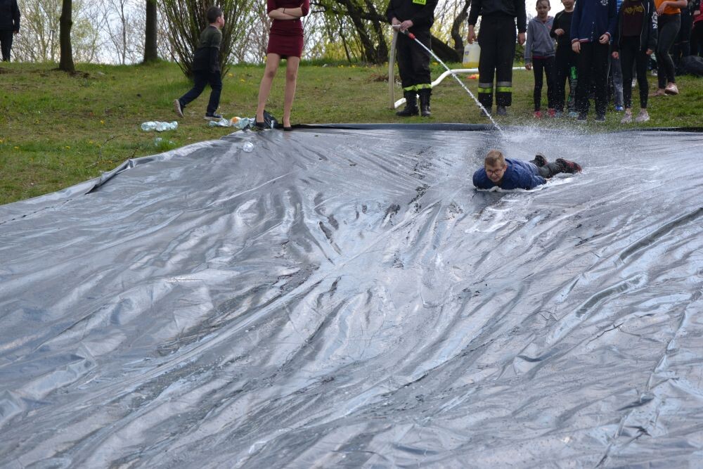 Na koniec strażacy zorganizowali zjeżdżalnię wodną na skarpie parku.
