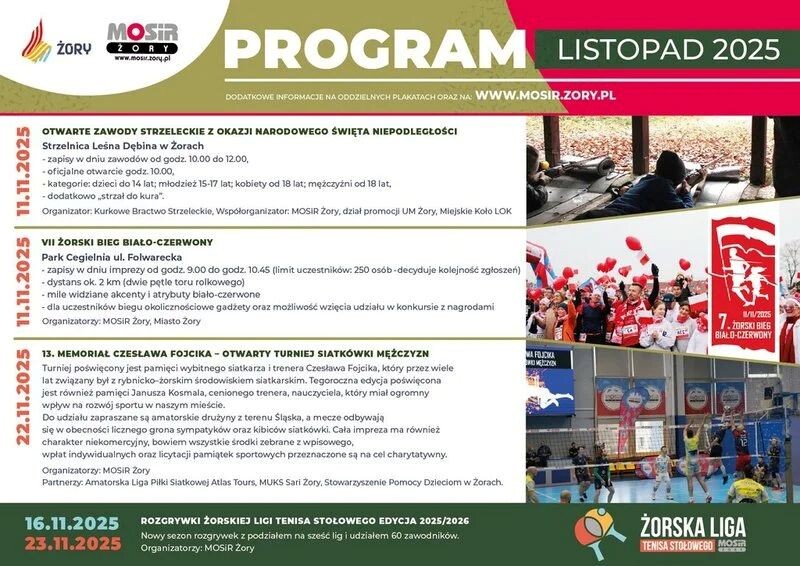 Miejski Ośrodek Sportu i Rekreacji w Żorach przygotował wyjątkowy program wydarzeń na listopad 2025. Wśród zaplanowanych imprez znalazły się zarówno sportowe wyzwania, jak i wydarzenia związane z obchodami Narodowego Święta Niepodległości.