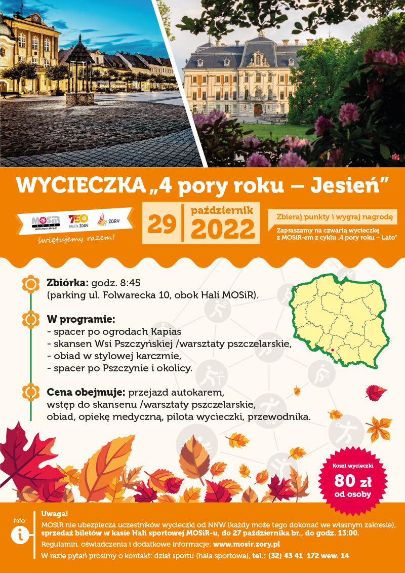 Miejski Ośrodek Sportu i Rekreacji w Żorach zaprasza mieszkańców naszego miasta w ramach cyklu wycieczek "4 pory roku – jesień" na kolejny wyjazd.