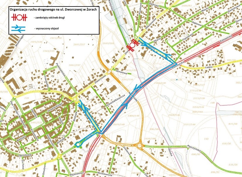 - linie 03 i 04 – autobusy będą jeździły z peronu przy ulicy Muzealnej (tj. przy GS-ie i siedzibie Muzeum Miejskiego) przez drogę krajową nr 81 (Wiślanka) i ul. Leśną, z pominięciem przystanku Dworcowa. Na okres objazdów w pobliżu skrzyżowania ul. Leśnej z ul. Mikołowską zlokalizowany będzie dodatkowy przystanek. Autobusy z Kleszczówki z przystanku Dworzec Kolejowy będą jeździły ul. Leśną i dalej drogą krajową nr 81 do peronu przy ul. Muzealnej, z pominięciem przystanków: Dworcowa - Kolejowa, Dworcowa.
