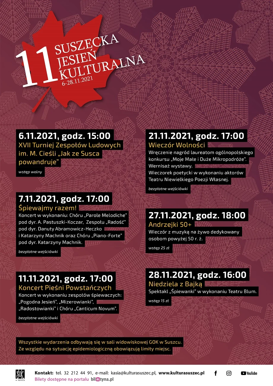 Gminny Ośrodek Kultury w Suszcu zaprasza na 11. Suszecką Jesień Kulturalną. Dla uczestników przygtowano aż sześć wydarzeń.