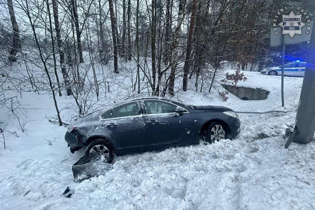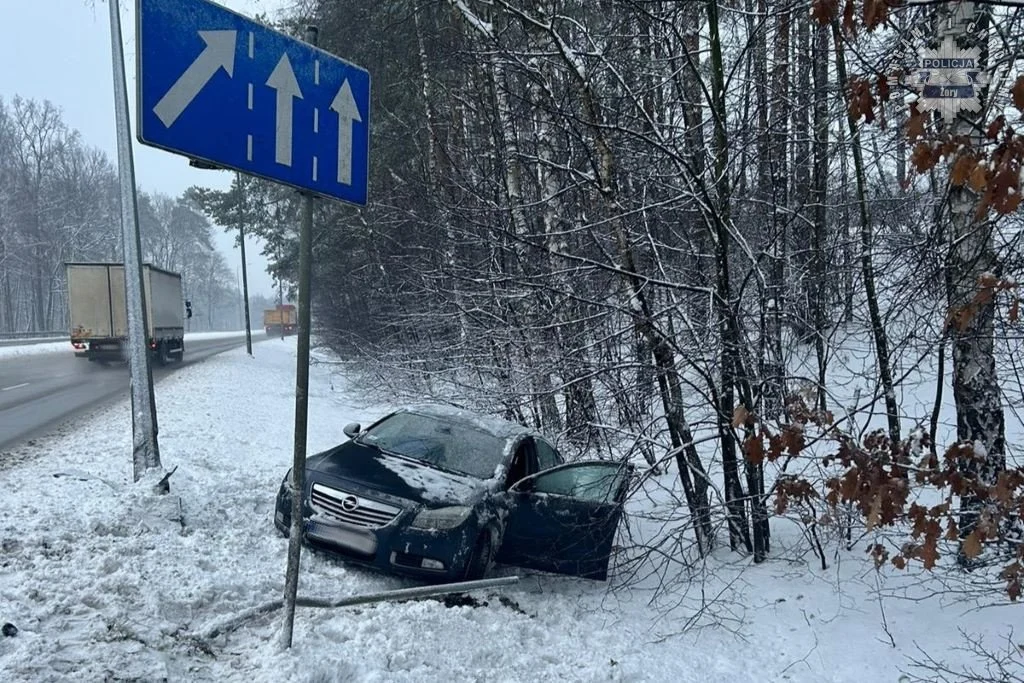 Około godziny 7:00, młoda kierująca oplem insignią straciła panowanie nad pojazdem podczas zmiany pasa. Auto wpadło w poślizg na zgromadzonym śniegu, w wyniku czego zjechało do rowu, po drodze uszkadzając znak i latarnię. Na szczęście 20-latka wyszła z tego zdarzenia bez poważniejszych obrażeń. Za niedostosowanie prędkości została ukarana mandatem karnym.