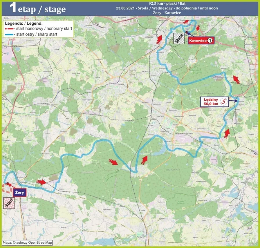 Kolarze ruszą spod hali MOSiR przy ul. Folwareckiej, gdzie zaplanowano start ostry. Peleton dojedzie do Alei Armii Krajowej, gdzie skręci w prawo i będzie kierował się do ul. Na Rudą, skąd kolarze pojadą ul. Pszczyńską w kierunku Rudziczki, a następnie skręcą w lewo na Orzesze – Zgoń. Meta 1 etapu zlokalizowana jest w Katowicach.