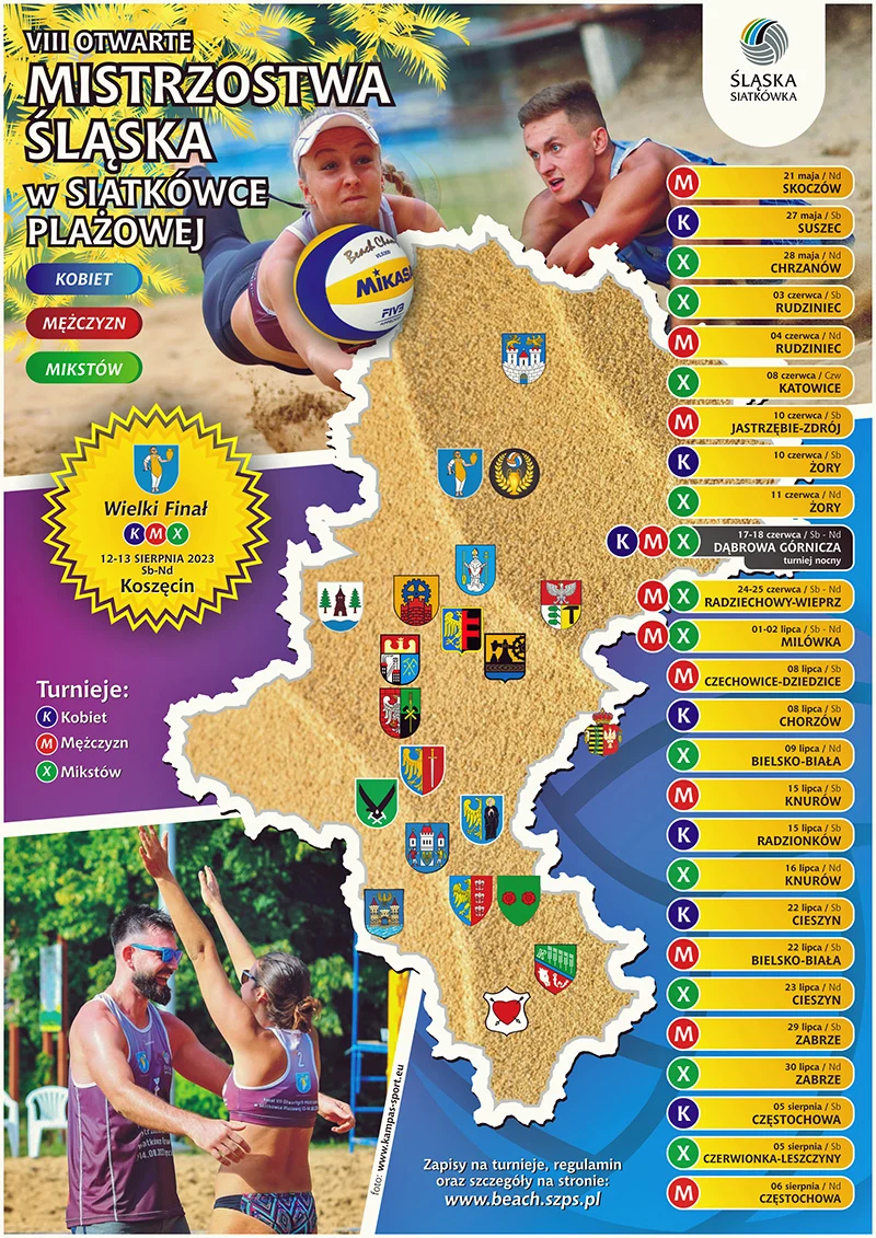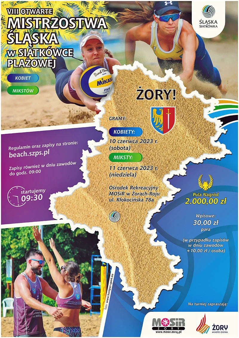 Miejski Ośrodek Sportu i Rekreacji w Żorach zaprasza do wzięcia udziału w turniejach w ramach 8. Otwartych Mistrzostwach Śląska w Siatkówce Plażowej – kategorie kobiet, mężczyzn oraz mikstów.