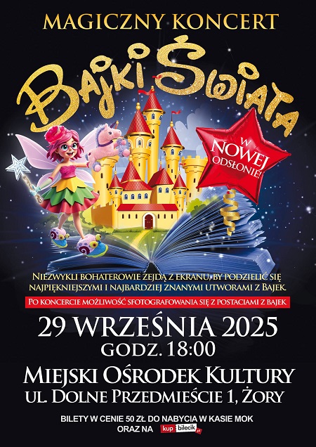 29 września w Miejskim Ośrodku Kultury w Żorach odbędzie się „Bajki Świata” – koncert pełen magii, muzyki, baniek mydlanych i baśniowych postaci.