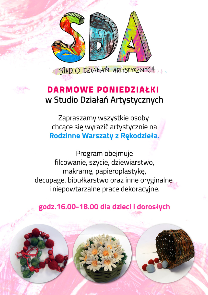 Miejski Ośrodek Kultury w Żorach zaprasza mieszkańców do Studia Działań artystycznych, gdzie w każdy poniedziałek, w godzinach od 16:00 – 18:00 odbywają się bezpłatne Rodzinne Warsztaty Rękodzieła. Zajęcia są przeznaczone zarówno dla dzieci, jak i dorosłych i obejmują: filcowanie, szycie, dziewiarstwo, makramę, papieroplastykę, bibułkarstwo oraz inne oryginalne i niepowtarzalne prace dekoracyjne.