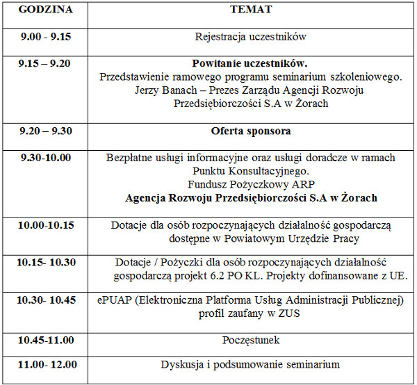 Miejsce seminarium: Agencja Rozwoju Przedsiębiorczości S.A. Żory, sala nr 19.