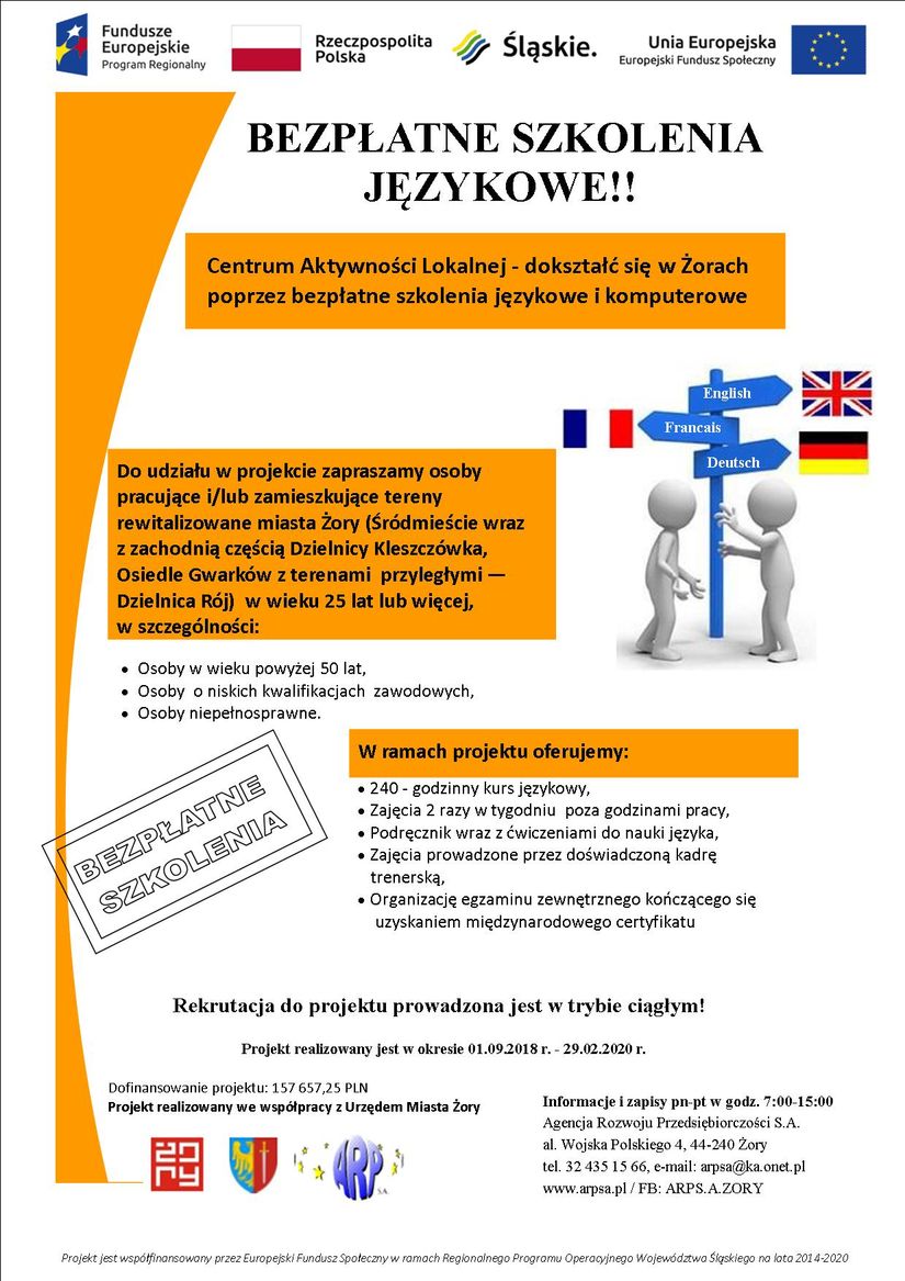 Projekt „Centrum Aktywności Lokalnej – dokształć się w Żorach poprzez bezpłatne szkolenia językowe i komputerowe”, współfinansowany jest ze środków Unii Europejskiej w ramach Europejskiego Funduszu Społecznego, a realizowany przez Agencję Rozwoju Przedsiębiorczości S.A.