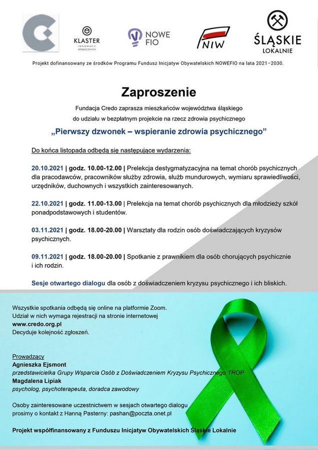 Fundacja Credo zaprasza mieszkańców województwa śląskiego do udziału w bezpłatnych spotkaniach online, w ramach projektu „Pierwszy dzwonek – wspieranie zdrowia psychicznego”, współfinansowanego z Funduszu Inicjatyw Obywatelskich Śląskie Lokalnie.