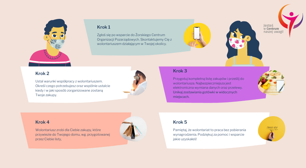 Krok 1. Zgłoś się po wsparcie do Żorskiego Centrum Organizacji Pozarządowych. Skontaktujemy Cięż wolontariuszem działającym w Twojej okolicy.