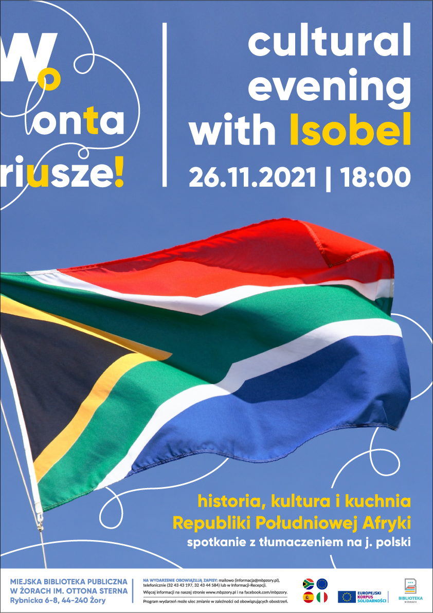 Isobel urodziła się i dorastała w Republice Południowej Afryki, a po ukończeniu szkoły średniej wyjechała na studia do Holandii. Tego wieczoru opowie o swoich doświadczeniach z życia w RPA, postara się przybliżyć złożoną historię tego kraju i to, jak dziś radzi on sobie z następstwami kolonizacji i apartheidu. Znajdzie się też czas na rozmowę o kulturze i kulinariach tego regionu.