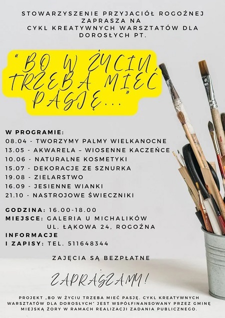 Projekt „Bo w życiu trzeba mieć pasję. Cykl kreatywnych warsztatów dla dorosłych” jest współfinansowany przez Gminę Miejską Żory w ramach realizacji zadania publicznego. Szczegóły na plakacie.