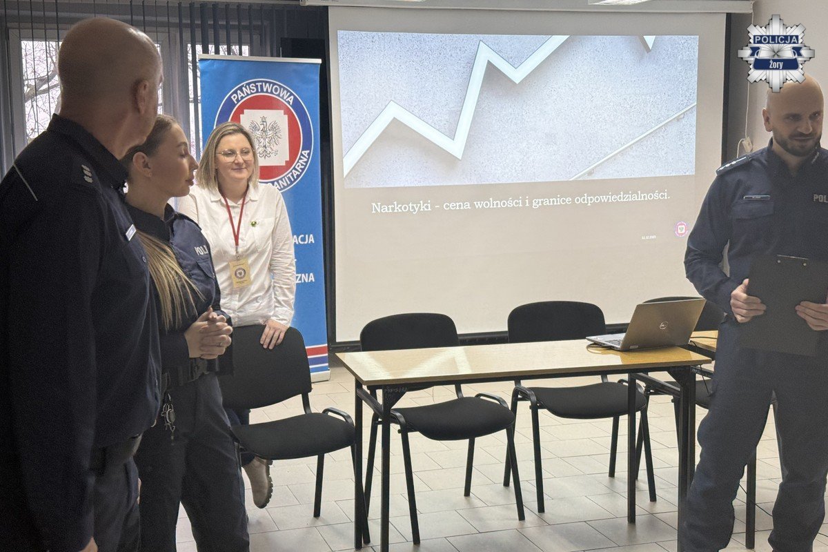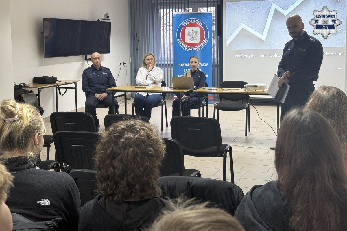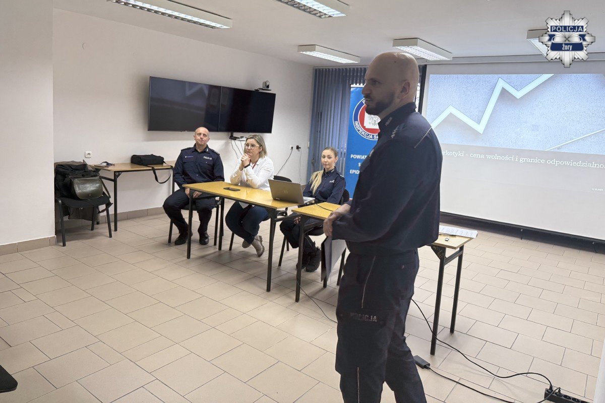 W Komendzie Miejskiej Policji w Żorach odbyła się debata poświęcona zagrożeniom związanym z narkotykami oraz konsekwencjom prawnym ich używania. W spotkaniu uczestniczyli uczniowie klas mundurowych Zespołu Szkół nr 3 im. Zbigniewa Herberta, którzy mieli okazję skonfrontować swoją wiedzę z doświadczeniem specjalistów. Debata stanowiła ważny element profilaktyki i miała skłonić młodzież do świadomych, odpowiedzialnych wyborów.