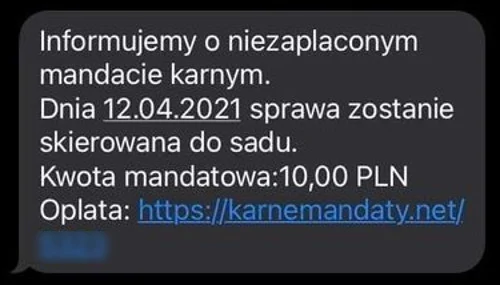 Treść SMS-a: Informujemy o niezapłaconym mandacie karnym. Dnia 12.04.2021 sprawa zostanie skierowana do sadu. Kwota mandatowa: 10,00 PLN Oplata: (podany link).