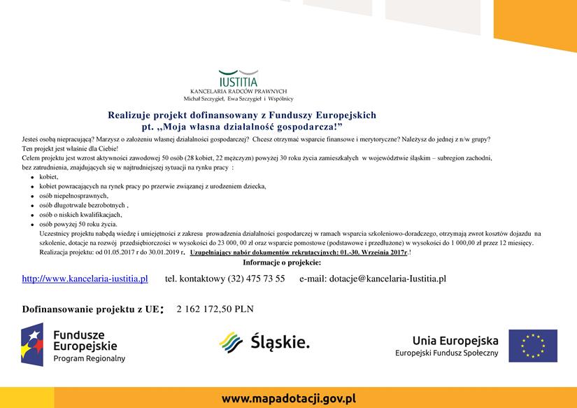 Jeśli nie pracujesz, a marzysz o założeniu własnej działalności gospodarczej, to ten projekt jest właśnie dla Ciebie! Kancelaria Radców Prawnych Pro Iustitia w Żorach jest beneficjentem projektu pn. „Moja własna działalność gospodarcza”w ramach którego można uzyskać wsparcie finansowe i merytoryczne w założeniu własnego biznesu.