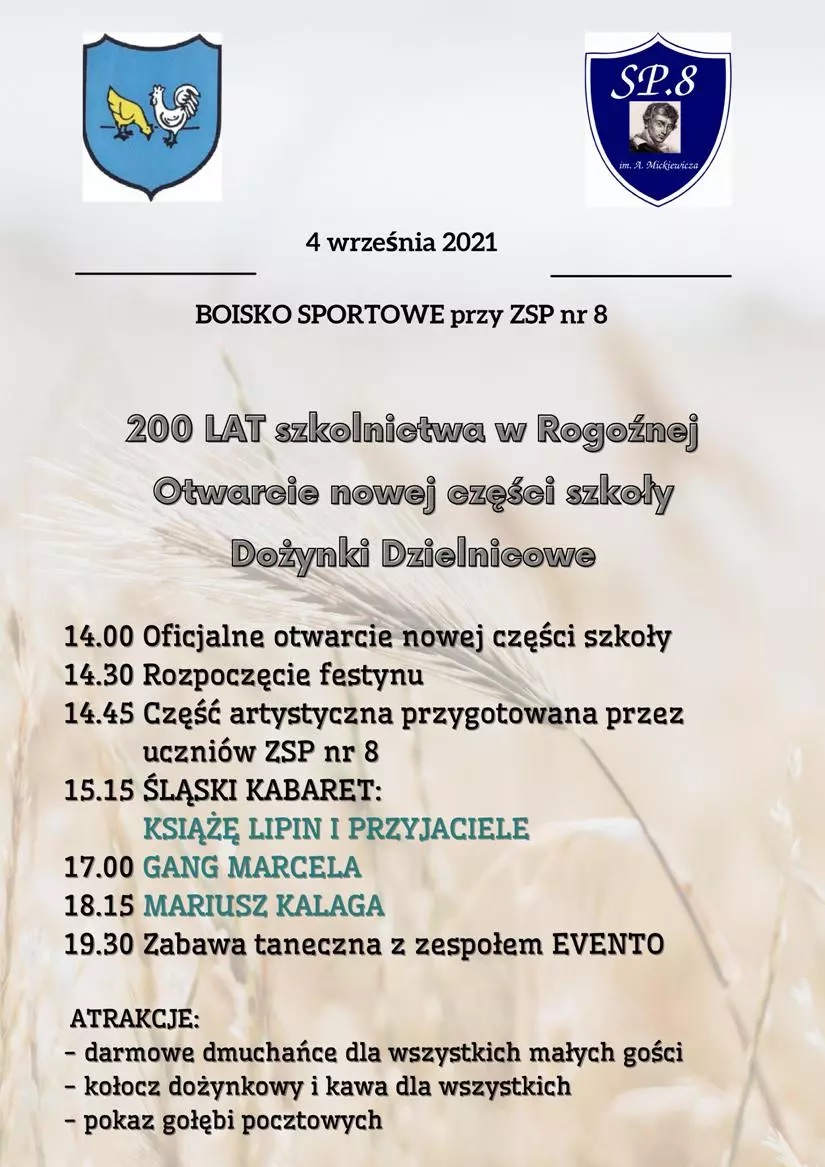 Zespół Szkolno-Przedszkolny nr 8 w Rogoźnej świętuje w tym roku 200-lecie szkolnictwa. Podczas uroczystych obchodów, które odbędą się w najbliższą sobotę na boisku szkolnym przy ul. Wysokiej, mieszkańcy żorskiej dzielnicy będą świętować również otwarcie nowej części szkoły, a także tegoroczne Dożynki.