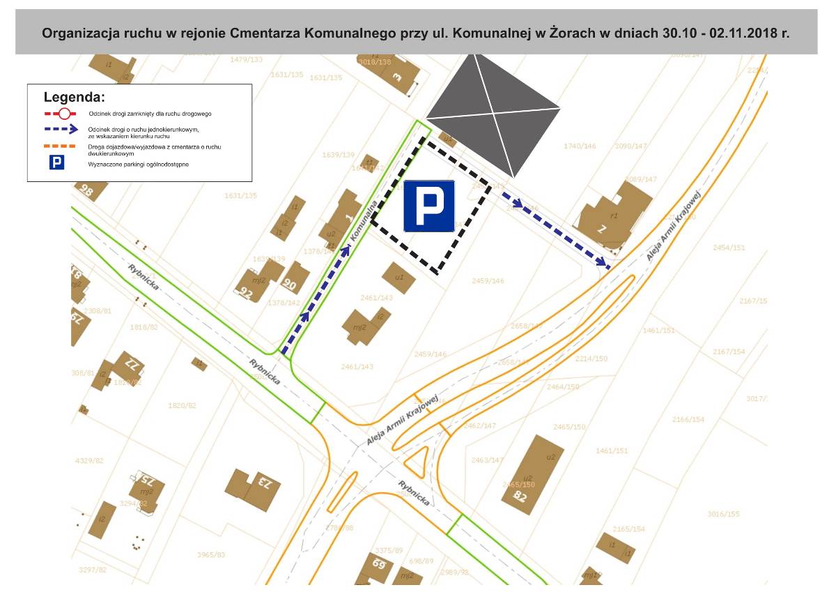- Cmentarz Komunalny przy ul. Komunalnej – wprowadzony zostaje ruch jednokierunkowy na ul. Komunalnej. Wjazd na parking przy cmentarzu będzie możliwy od ul. Rybnickiej, natomiast wyjazd w stronę al. Armii Krajowej.