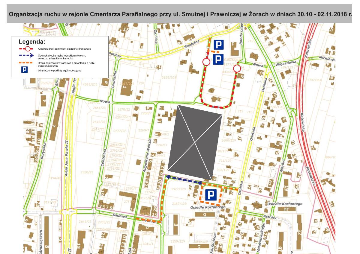 - Cmentarz Parafialny przy ul. Smutnej i Prawniczej – Smutna zostanie zamknięta na odcinku od wjazdu na parking do skrzyżowania z ul. Nową. Dojazd do cmentarza od strony ul. Smutnej będzie możliwy tylko do parkingu. Ponadto wprowadzony zostanie ruch jednokierunkowy na ul. Prawniczej na odcinku od parkingu przy bloku nr 6 os. Korfantego do skrzyżowania z ul. Sądową. Kierujący mają możliwość wjazdu na parking od strony ul. Osińskiej, natomiast wyjazd będzie możliwy ul. Prawniczą w stronę ul. Sądowej.