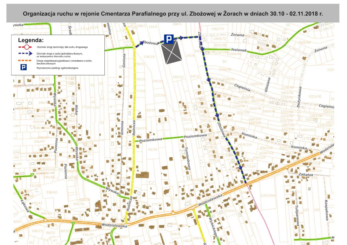 - Cmentarz Parafialny przy ul. Zbożowej – obowiązywał będzie ruch jednokierunkowy na całej długości drogi. Wjazd na cmentarz będzie możliwy od ul. Rolniczej, natomiast wyjazd ul. Zbożową do skrzyżowania z ul. Wodzisławską.