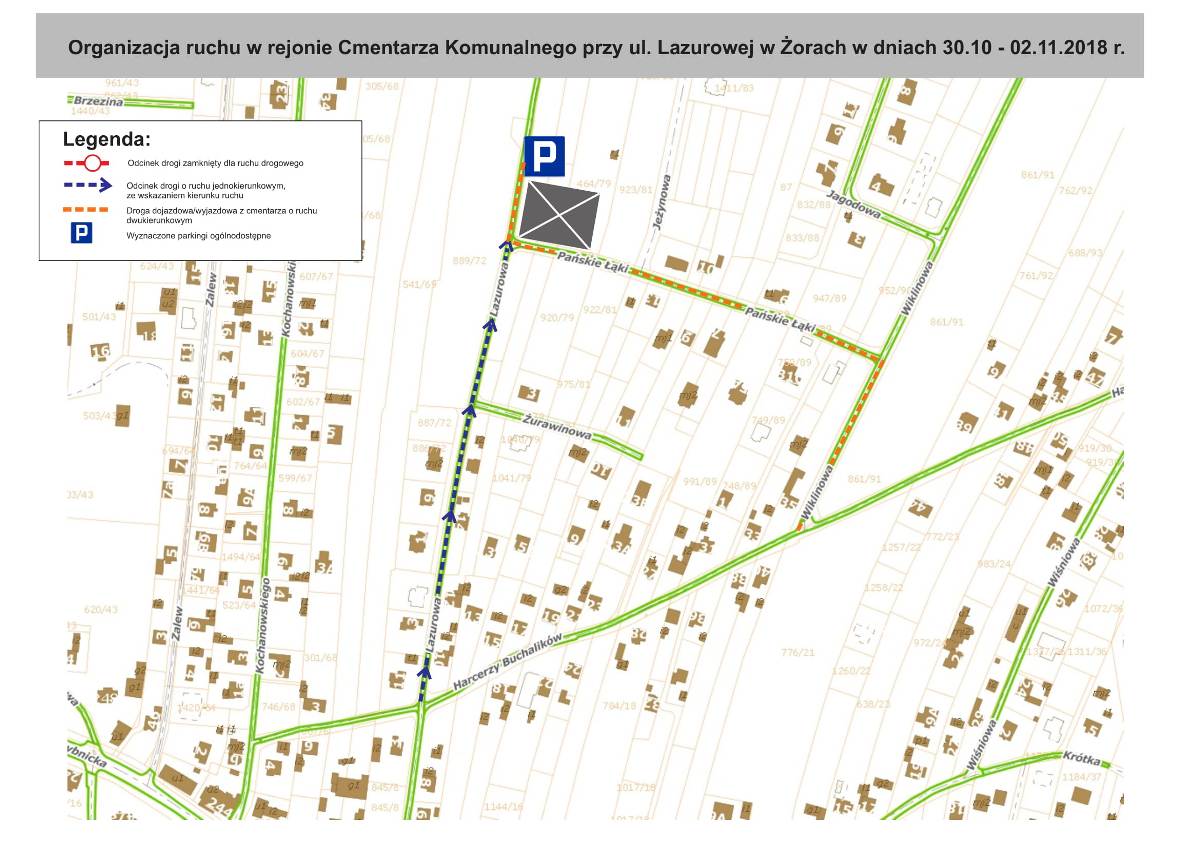 - Cmentarz Komunalny przy ul. Lazurowej – wprowadzony zostanie ruch jednokierunkowy na odcinku ul. Lazurowej – od skrzyżowania z ul. Harcerzy Buchalików do skrzyżowania z ul. Pańskie Łąki. Dojazd do cmentarza będzie możliwy ul. Lazurową bądź ul. Pańskie Łąki, natomiast wyjazd z cmentarza będzie możliwy ul. Pańskie Łąki, następnie ul. Wiklinową do ul. Harcerzy Buchalików i do ul. Lazurowej.