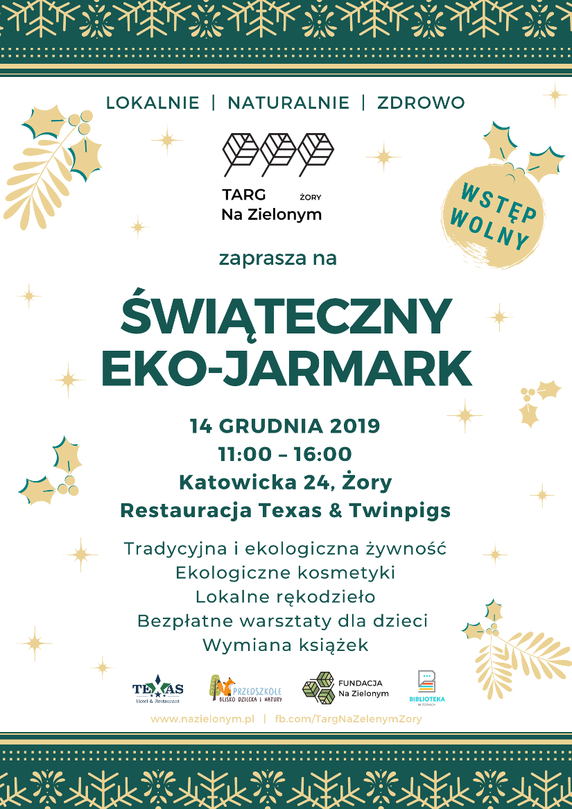 Już w sobotę, 14 grudnia po raz pierwszy w Żorach odbędzie się Świąteczny Eko-Jarmark, organizowany przez Fundację Na Zielonym, promującą zdrowy tryb życia. Fundacja poprzez swoje działania wspiera lokalnych rolników oraz małych wytwórców żywności, produkowanej tradycyjnymi i ekologicznymi metodami. Zakupy będzie można zrobić w godzinach 11:00 – 16:00 w restauracji Texas, zlokalizowanej przy ul. Katowickiej 24 w Żorach, przy Amerykańskim Parku Rozrywki Twinpigs.