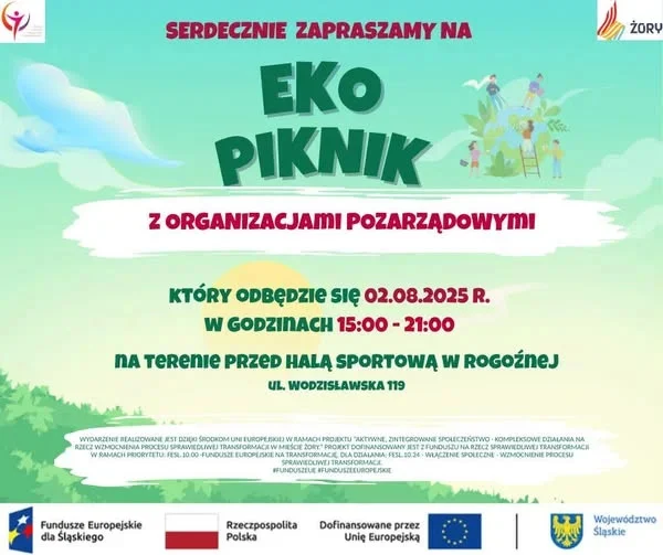 Już 2 sierpnia 2025 roku, w sobotę, przed halą sportową w Rogoźnej (ul. Wodzisławska 119) odbędzie się wyjątkowe wydarzenie – EKO PIKNIK z Organizacjami Pozarządowymi. To doskonała okazja, by spędzić aktywne, ekologiczne popołudnie z rodziną i przyjaciółmi.