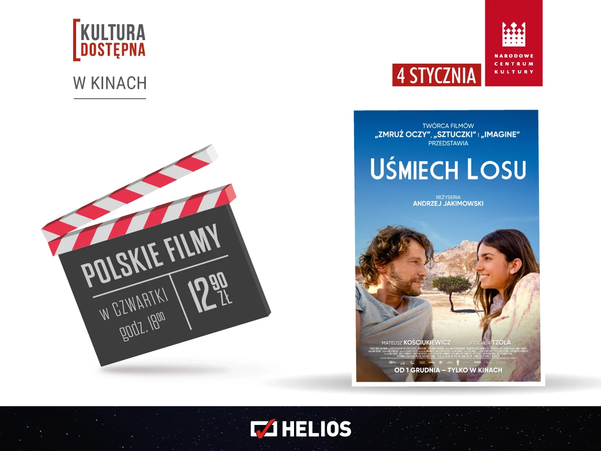 Na czwartek, 4 stycznia, zaplanowany jest seans romansu „Uśmiech losu” (cykl Kultura Dostępna). Andrzej przybywa na grecką wyspę, aby objąć spadek po stryju. Rozczarowany tym, co zastał na miejscu, postanawia jak najszybciej sprzedać odziedziczoną własność i wrócić do kraju. Wcześniej jednak musi odpracować dług, który jego stryj zaciągnął u greckiego sąsiada. Plan komplikuje się, kiedy chłopak poznaje piękna Greczynkę.