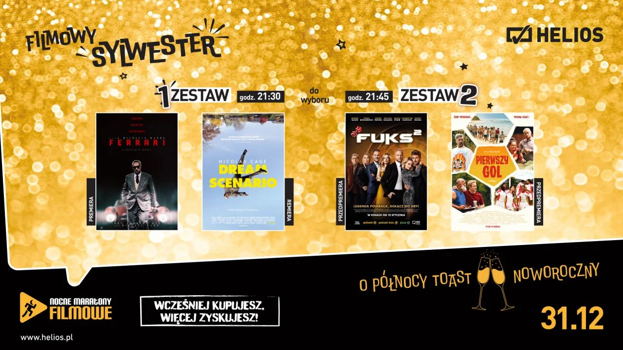 Helios zaprasza do sylwestrowej zabawy w towarzystwie gwiazd światowego kina, podczas Filmowego Sylwestra z dwoma zestawami filmów do wyboru. Na początek pierwszego zestawu w doskonały nastrój z dużą prędkością wprowadzą widzów Penelope Cruz i Adam Driver w filmie „Ferrari”, a po przerwie na powitanie Nowego Roku, ich miejsce zajmie Nicolas Cage w poruszającej komedii „Dream Scenario”. W komediowym zestawie drugim, widzowie zobaczą m.in.: Paulinę Gałązkę, Macieja Stuhra i Cezarego Pazurę w filmie „Fuks 2”. Po przerwie na noworoczny toast, za świetny nastrój kinomanów odpowiadać będzie Michael Fassbender, jako trener najgorszej drużyny świata, w filmie „Pierwszy Gol”.