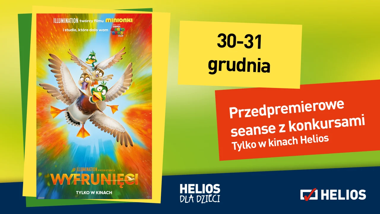 W tym samym terminie Helios zaprasza także na przedpremierowe pokazy bajki „Wyfrunięci”. Rodzina kaczek mieszka spokojnie w Nowej Anglii. W mamie budzi się jednak zew przygody i rusza z mężem oraz dziećmi w podróż przez Nowy Jork na Jamajkę! To wzruszająca opowieść o znaczeniu rodziny, przygodzie i możliwości wyjścia ze swojej strefy komfortu. Podczas ostatniego weekend roku,o godzinie 10 i 12:15 odbędą się też specjalne seanse tej produkcji poprzedzone licznymi konkursami.