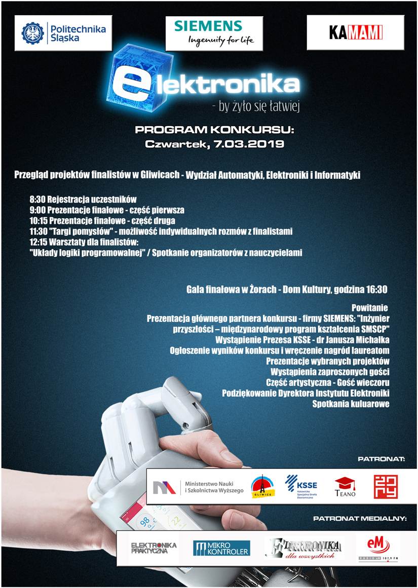 Konkurs na najciekawszy projekt z dziedziny elektroniki, informatyki lub automatyki pn. „Elektronika – by żyło się łatwiej” jest organizowany dzięki współpracy Instytutu Elektroniki Politechniki Śląskiej z firmami SIEMENS Polska i KAMAMI, a także z Urzędem Miasta Żory, Katowicką Specjalną Strefą Ekonomiczną S.A. oraz żorską Fundacja TEANO. Konkurs kierowany jest do uczniów szkół ponadgimnazjalnych, w szczególności liceów o profilach matematyczno-fizycznych i politechnicznych oraz techników elektronicznych, mechatronicznych, informatycznych, automatycznych i pokrewnych. Jego celem jest wyróżnienie autorów najciekawszych projektów, prezentujących praktyczne zastosowania szeroko pojętej elektroniki, takich jak: układy elektroniczne, systemy mechatroniczne, aplikacje sterowników programowalnych PLC takich jak SIMATIC S7, LOGO! oraz innych, aplikacje na mikrokontrolerach, aplikacje na smartfony i tablety, programy komputerowe itp.