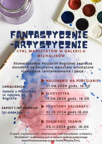 W imieniu Stowarzyszenia Przyjaciół Rogoźnej, które realizuje projekt pt. „Fantastycznie-artystycznie. Cykl warsztatów w Galerii u Michalików”, UM Żory zaprasza dorosłych mieszkańców miasta na zajęcia poświęcone malowaniu na porcelanie. Udział w spotkaniu jest bezpłatny, jednakże z przyczyn organizacyjnych prosimy o wcześniejsze zapisywanie się pod nr tel. 511 648 344.