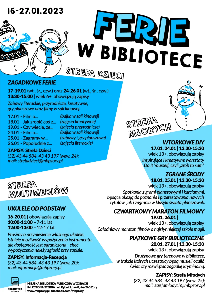 W czasie ferii zimowych koniecznie musiciezajrzeć do Miejskiej Biblioteki Publicznej w Żorach. Będzie tam można miło spędzić czas ze znajomymi, korzystając z przestrzeni i zajęć, które przygotowano w dniach od 16 do 27 stycznia 2023 r.