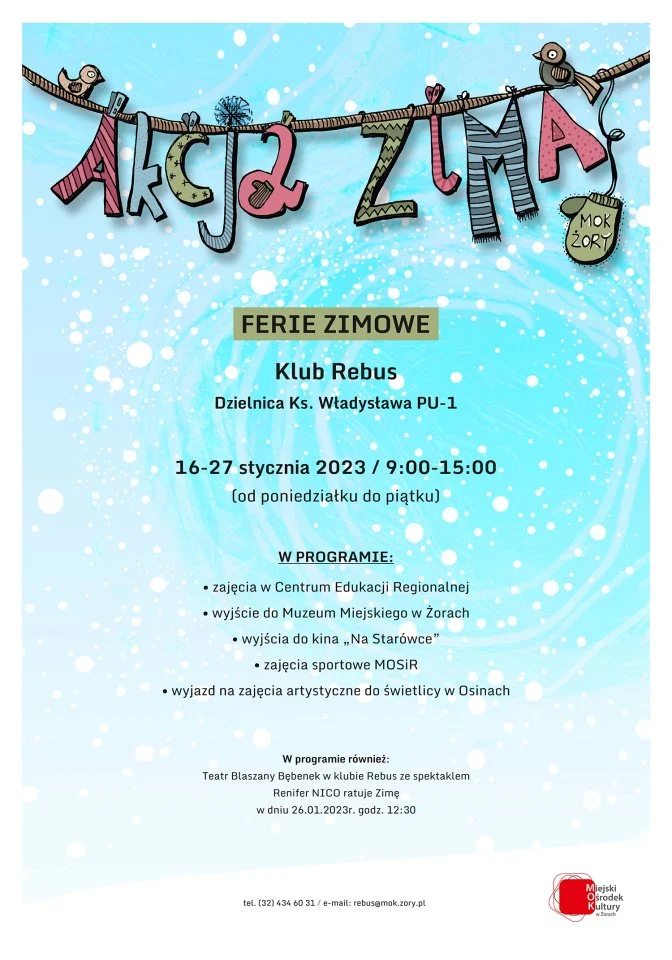 z MOSiR-em, teatrzyk oraz gry, zabawy i warsztaty na miejscu – w klubie. Zajęcia będą się odbywać od poniedziałku do piątku w dniach od 16 do 27 stycznia w godzinach od 9:00 do 15:00.