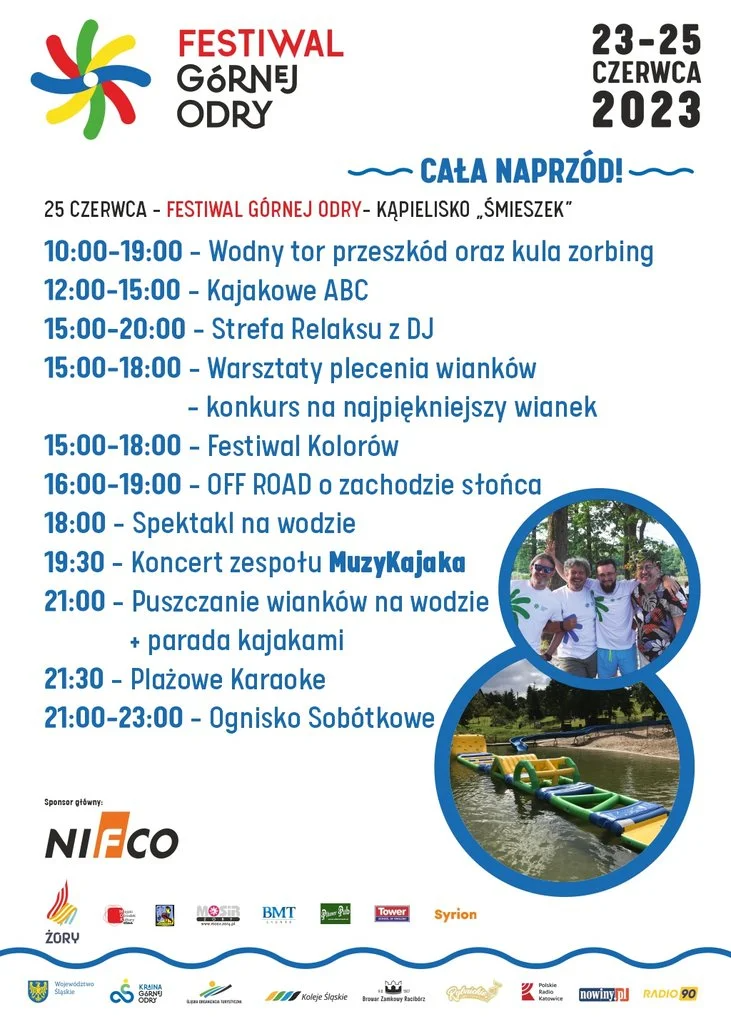 Następnie od godz. 12:00 rusza Kajakowe ABC, czyli nauka pływania kajakiem, połączona z ciekawymi warsztatami. Odrobinę później, bo o 15:00 startuje strefa relaksu z DJ-em, Festiwal Kolorów z wyrzutami proszków holi oraz warsztaty plecenia wianków. Później na gości czekały będą m.in. OFF ROAD o zachodzie słońca i wyjątkowy spektakl na wodzie. O godz. 19:00 na scenie zaprezentuje się żorski zespół MuzyKajaka, a po koncercie zapraszamy wszystkich na puszczanie wianków, sobótkowe ognisko oraz plażowe karaoke!