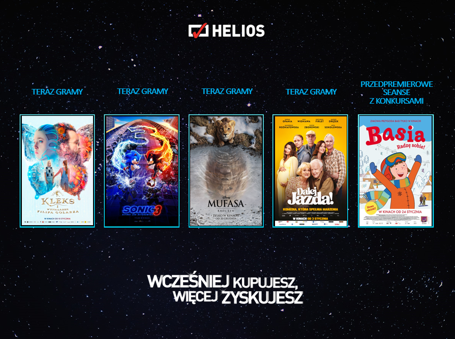 W styczniu w kinach Helios z pewnością nie zabraknie porywających tytułów! Szczegóły dotyczące seansów w aktualnym repertuarze oraz bilety dostępne są na stronie www.helios.pl, w aplikacji mobilnej oraz w kasach kinowych sieci w całej Polsce.