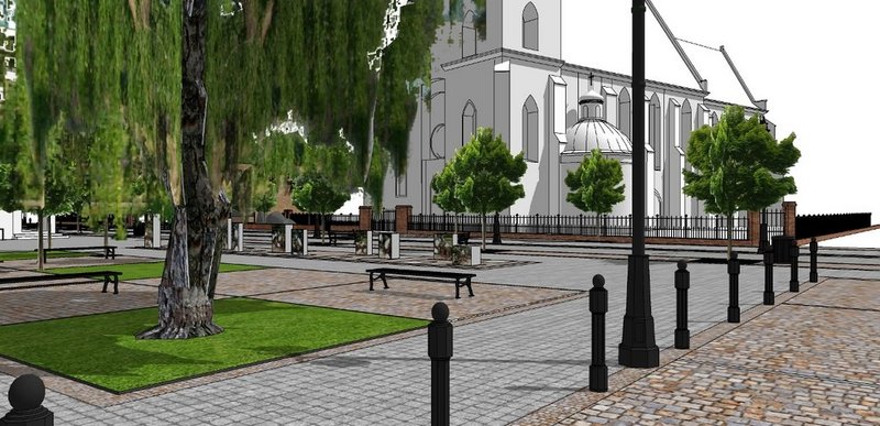 Skwer u zbiegu ogrodzenia kościoła  pw. św. Filipa i Jakuba oraz zespołu pocmentarnego zaprojektowano jako strefę wypoczynkowo-dydaktyczną. Istniejący teren zielony zostanie uporządkowany i ograniczony murkiem wykończonym panelami z cortenu, który będzie pełnił również funkcję siedziska. Wnętrze murku wypełni dywan z trawy.
