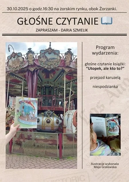 30 października o 16:30 na żorskim rynku odbędzie się głośne czytanie książki „Utopek, ale kto to?” z przejażdżką karuzelą i niespodzianką. Spotkanie poprowadzi autorka Daria Szmelik.