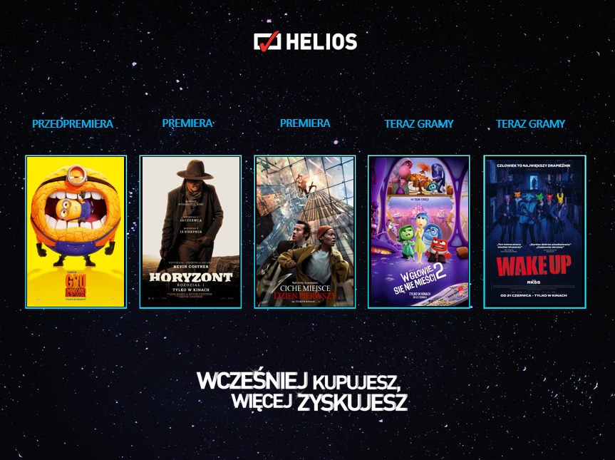 Wakacje rozpoczynają się mocnym filmowym akcentem w postaci wyczekiwanych premier. Od najbliższego piątku na wielkich ekranach pojawią się: „Ciche miejsce: Dzień pierwszy” oraz „Horyzont. Rozdział 1”. Ponadto w repertuarze zagoszczą hity dla widzów w każdym wieku – w tym seanse przedpremierowe animacji „Gru i Minionki: Pod przykrywką”. Przez cały okres wakacji trwa filmowy konkurs „Aktywne lato” – Helios zaprasza wszystkich widzów do wspólnej zabawy!