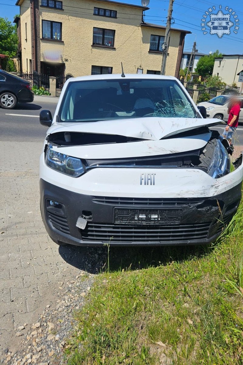 Kierujący dostawczym fiatem wjeżdżając na przeciwny pas ruchu, nie dał szansy motocykliście na uniknięcie zderzenia i doprowadził do zdarzenia drogowego. Za spowodowanie kolizji kierowca samochodu został ukarany mandatem w wysokości 1500 złotych oraz 10 punktami karnymi.