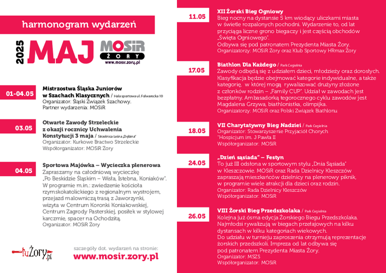 Zachęcamy do zapoznania się z harmonogramem zajęć i wydarzeń, organizowanych przez Miejski Ośrodek Sportu i Rekreacji w Żorach w maju 2025 roku. Można wziąć udział m.in. w Mistrzostwach Śląska Juniorów w Szachach Klasycznych czy spędzić majówkę na sportowo!