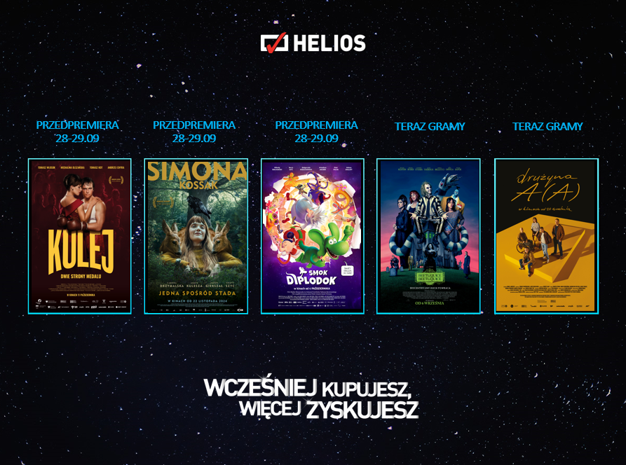 W najbliższych dniach widzowie kin Helios mogą spodziewać się wielu filmowych wrażeń. Wielkim wydarzeniem będzie Święto Kina, odbywające się już 28 i 29 września, dzięki któremu bilety będą dostępne w cenie jedynie 13 złotych. Na wielkich ekranach znajdą się przedpremierowo wyczekiwane polskie tytuły, takie jak: „Kulej. Dwie strony medalu” oraz „Simona Kossak”, które będą wyświetlane tylko podczas najbliższego weekendu, jak również najpopularniejsze hity i lubiane seanse specjalne.