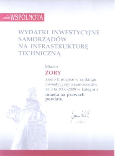 Pismo Samorządu Terytorialnego “Wspólnota” we współpracy z naukowcami Uniwersytetu Warszawskiego, przygotowało ranking samorządów za lata 2006-2008, w którym kryterium oceny stanowiła ilość podejmowanych inwestycji w infrastrukturę techniczną. Żory wśród miast na prawach powiatu zajęły w rankingu II miejsce.