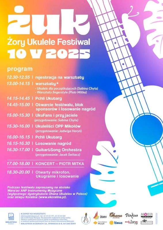Żory znów zabrzmią radosnym dźwiękiem ukulele! Już 10 maja 2025 roku Biblioteka w Żorach zaprasza na III ŻUK Żory Ukulele Festiwal. Wstęp na wydarzenie jest wolny, a w programie nie zabraknie muzycznych emocji, warsztatów, koncertów i niespodzianek.