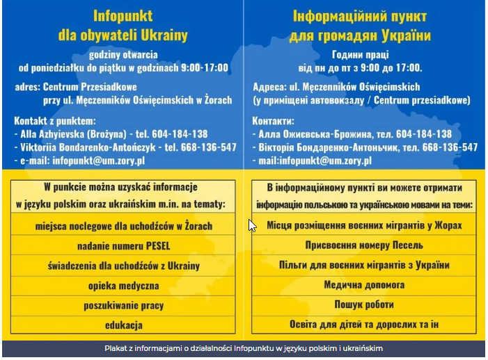У Жорах є місце, де можна отримати всю інформацію про допомогу воєнниммігрантам з України. Це інформаційний пункт для громадян України, який працює на території автовокзалу за адресою ul. Męczenników Oświęcimskich з понеділка до п’ятниці з 9:00 до 17:00. Його співробітники, які володіють польською та українською мовами, допомагають біженцям з України, надаючи їм відповіді на всі питання, пов’язані з їх перебуванням у нашому місті. В інформаційному пункті можна отримати наступну інформацію та допомогу: