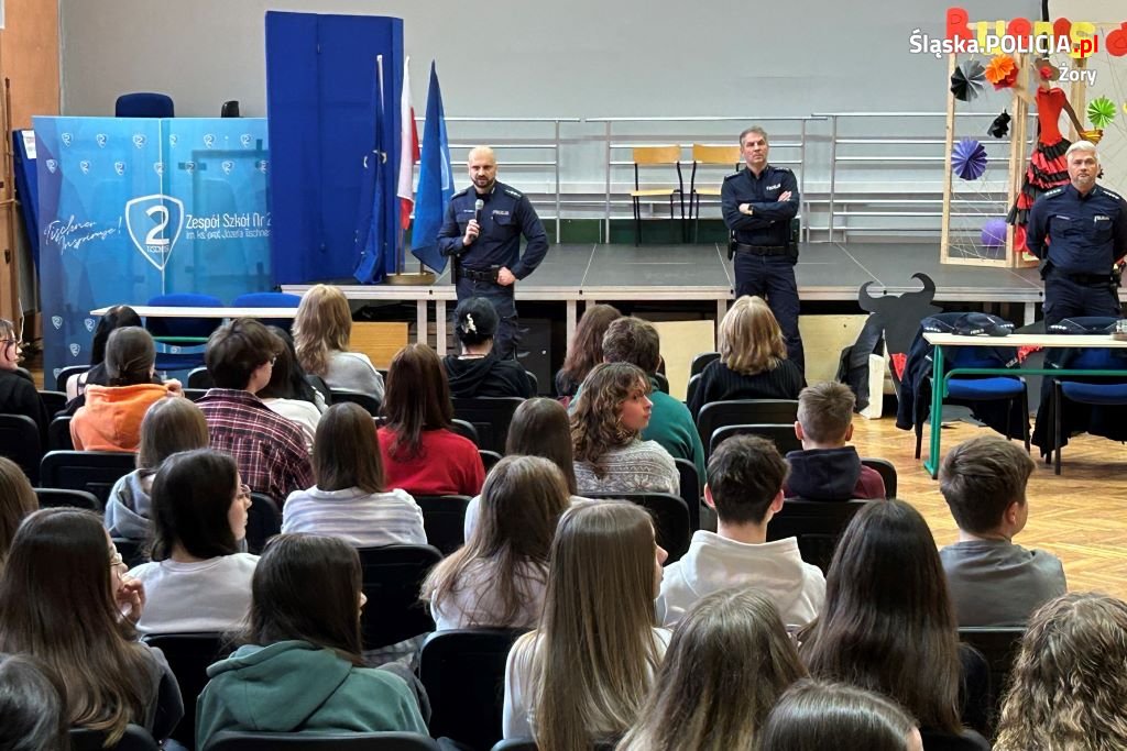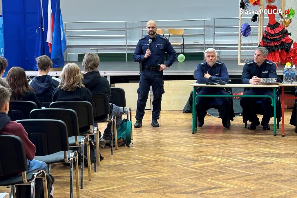 W szkole i w czasie wolnym młodzi ludzie często spotykają sytuacje i zachowania, które mogą stanowić dla nich zagrożenie, a czasem wiązać się z odpowiedzialnością karną. Niektóre problemy dotyczące młodego człowieka mogą być niewidoczne na pierwszy rzut, a wywierają na niego ogromny wpływ. Profilaktyk żorskiej Policji – aspirant Witold Lisiak, dzielnicowi: aspirant sztabowy Andrzej Staroszczuk oraz aspirant sztabowy Tomasz Chromik zwrócili dziś uwagę młodzieży na problem hejtu w internecie, a także odpowiedzialność nieletnich za swoje czyny.