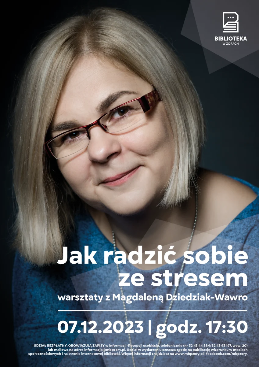 W czwartek 7 grudnia o godzinie 17:30 Miejska Biblioreka w Żorach zaprasza do udziału w warsztatach z Magdaleną Dziedziak-Wawro “Jak radzić sobie ze stresem”.