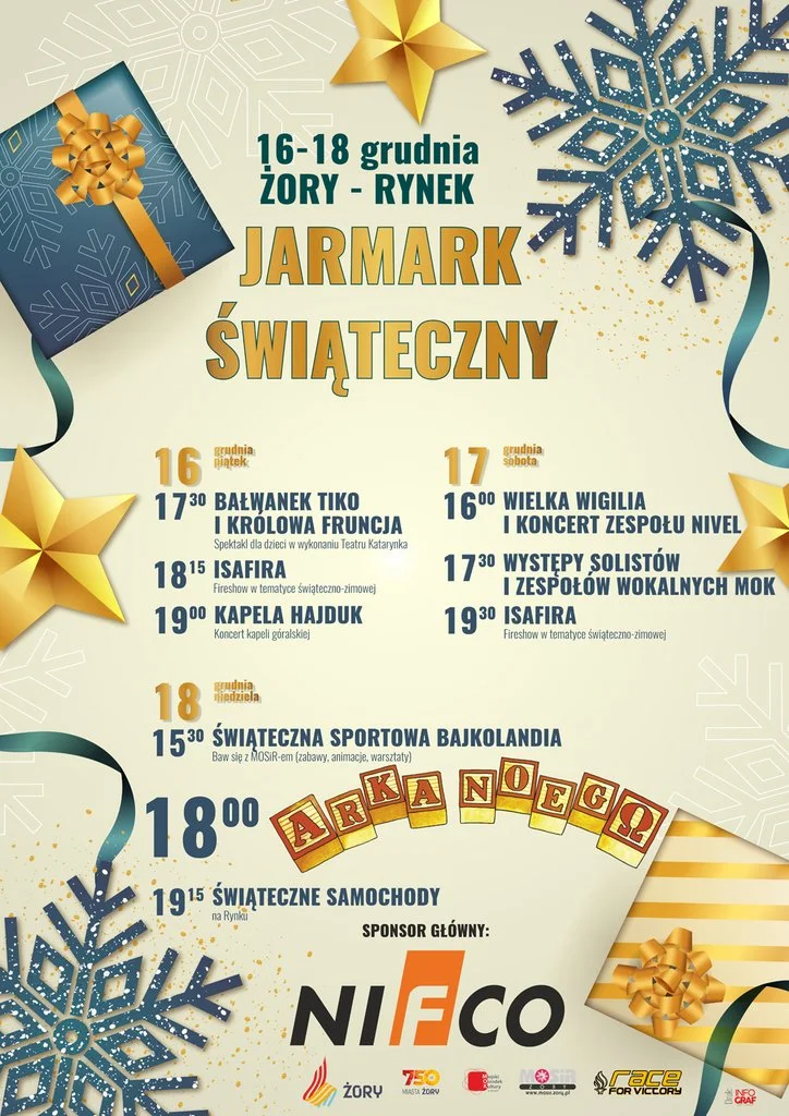 Świąteczne ozdoby, pyszne jedzenie, zapach grzanego wina i liczne atrakcje artystyczne sprawią, że żorski Rynek na trzy dni zmieni się w prawdziwy Jarmark Świąteczny. Gwiazdą tegorocznego Jarmarku w naszym mieście będzie zespół Arka Noego! Sponsorem głównym imprezy jest firma NifcoKorea Poland Sp z o.o.