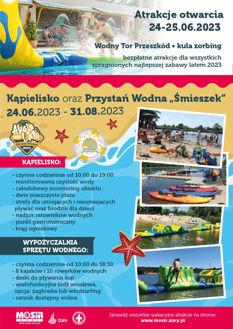 Palące słońce i ostatni szkolny dzwonek zwiastują początek tegorocznych wakacji. To czas urlopu, aktywnego wypoczynku, oraz zażywania słonecznych i wodnych kąpieli. Na mieszańców pozostających w mieście idealnym miejscem do skorzystania z wyżej wymienionych atrakcji ponownie, tak jak w ubiegłym roku, czeka przygotowany „Śmieszek”. To wyjątkowe miejsce od lat przyciąga swoim urokliwym widokiem a od czterech lat jest jedynym otwartym latem i nadzorowanym kąpieliskiem w Żorach. Miejski Ośrodek Sportu i Rekreacji administrujący latem kąpieliskiem Śmieszka informuje, iż w tym roku akwen wodny ponownie posiadać będzie status kąpieliska. Tym samym MOSiR dokonywać będzie bieżącej oceny jakości wody, wyznaczy strefy dla umiejących i nieumiejących pływać, wydzieli brodzik dla dzieci, a także zatrudni odpowiednia ilość ratowników.